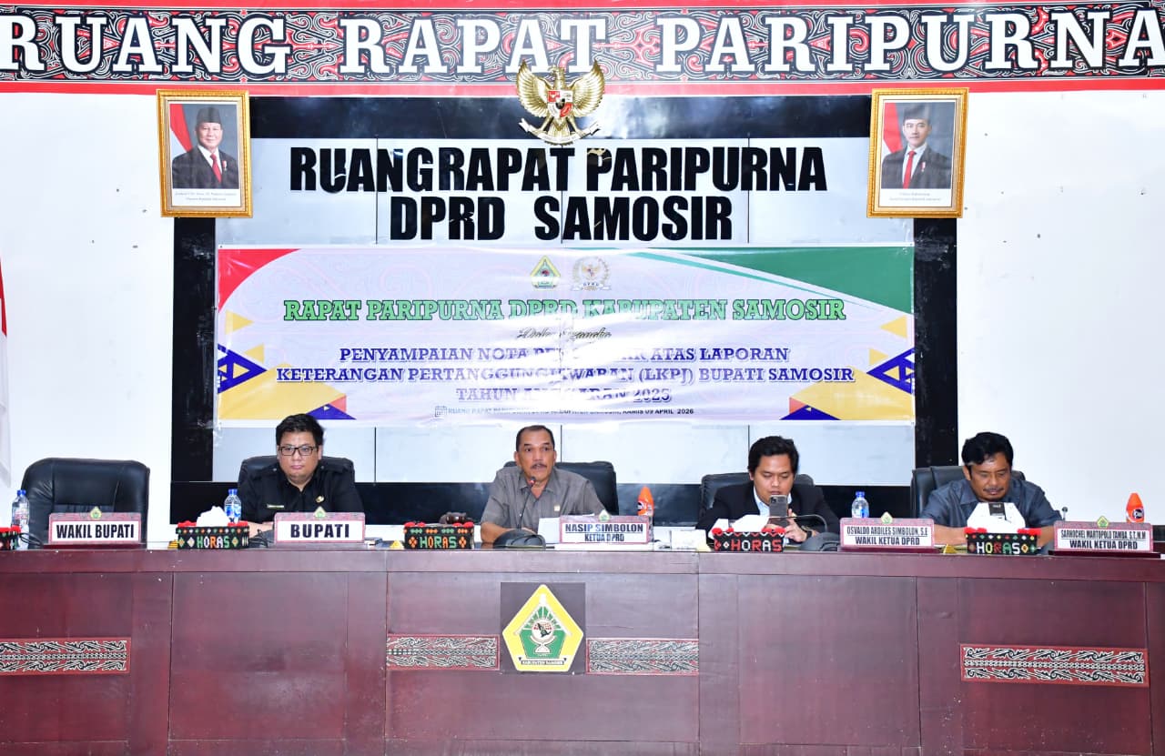 JurnalisIndoNews.com|Samosir – Bupati Samosir menyampaikan Nota Pengantar Laporan Keterangan Pertanggungjawaban (LKPJ) Tahun Anggaran 2025 dalam rapat paripurna DPRD Kabupaten Samosir yang digelar di Gedung DPRD, 09/04/2026.